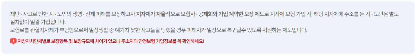 지자체별로 보장 항목과 보장 금액이 다를 수 있으므로, 거주하고 있는 지자체의 시민안전보험 내용을 확인하는 것이 중요합니다.